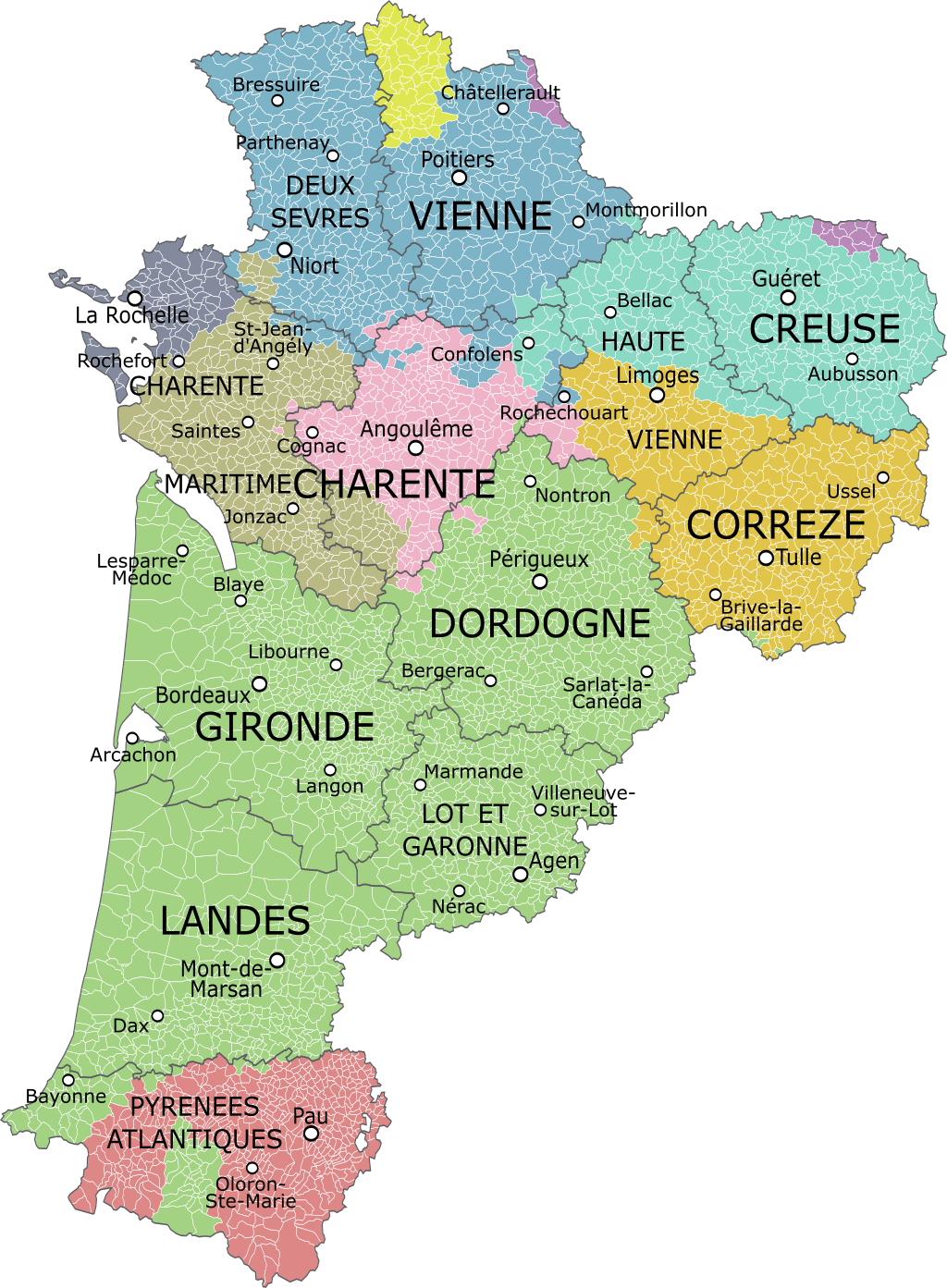 Source : La Poste, « Trouver un code postal », La Poste, 2024 ; INSEE, « Populations légales 2020 », INSEE, 2023 ; Wikipédia, « Nouvelle-Aquitaine », Wikipédia.