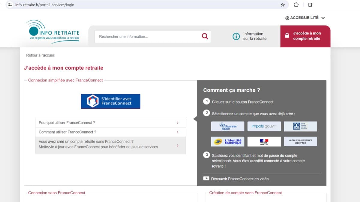 - Connectez-vous avec FranceConnect ou vos identifiants Info Retraite.